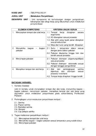 Unit ini berlaku untuk menyiapkan tempat dan alat kerja, menyetrika bagian –