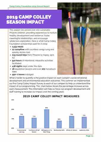 What's harder to quantify is the positive impact on each camper's social-emotional development and environmental education outcomes. This summer we implemented our first Camp Colley Impact Survey to each of our campers to help us understand the impact of our programming. The chart below shows the percentage increase across each measurement. This information will help us focus our program development and staff training to increase our impact over the coming years.