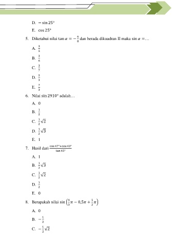 5. Diketahui nilai tan = − dan berada dikuadran II maka sin =…