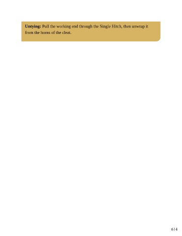 Untying: Pull the working end through the Single Hitch, then unwrap it from the horns of the cleat. 614
