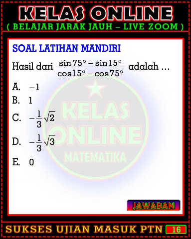 SOAL LATIHAN MANDIRI Hasil dari sin 75 sin15 adalah … cos15 cos75 A. 1 B. 1 C. 1 2 3 D. 1 3 3 E. 0 16
