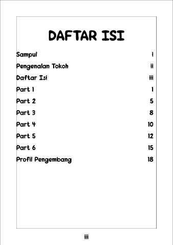 DAFTAR ISI Sampul i Pengenalan Tokoh ii Daftar Isi iii Part 1 1 Part 2 5 Part 3 8 Part 4 10 Part 5 12 Part 6 15 Profil Pengembang 18 iii