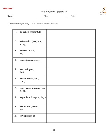 Name:_________________________ Part 3- Binyan Pi'el - pages 19-32 Date: ________________