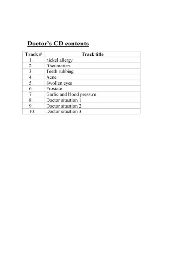 Doctor’s CD contents Track # Track title 1. nickel allergy 2. Rheumatism 3. Teeth rubbing 4. Acne 5. Swollen eyes 6. Prostate 7. Garlic and blood pressure 8. Doctor situation 1 9. Doctor situation 2 10. Doctor situation 3
