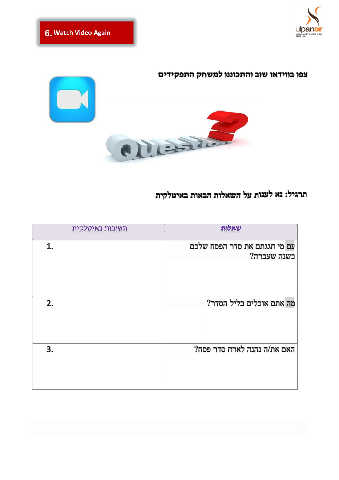 םידיקפתה קחשמל וננוכתהו בוש ואדיווב ופצ תיקלטיאב תואבה תולאשה לע תונעל אנ :ליגרת 1. םכלש חספה רדס תא םתגגח ימ םע ? הרבעש הנשב 2. ? רדסה לילב םילכוא םתא המ 3. ? חספ רדס חראל הנהנ / ה תא םאה