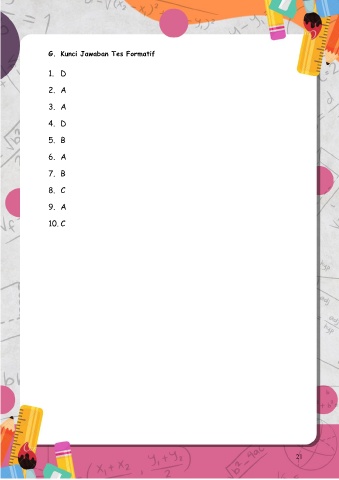G. Kunci Jawaban Tes Formatif 1. D 2. A 3. A 4. D 5. B 6. A 7. B 8. C 9. A 10. C 21