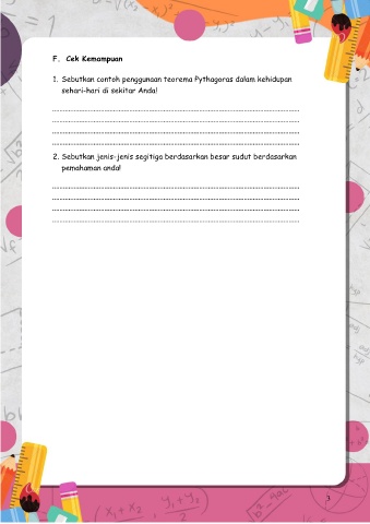 F. Cek Kemampuan 1. Sebutkan contoh penggunaan teorema Pythagoras dalam kehidupan sehari-hari di sekitar Anda! 2. Sebutkan jenis-jenis segitiga berdasarkan besar sudut berdasarkan pemahaman anda! 3