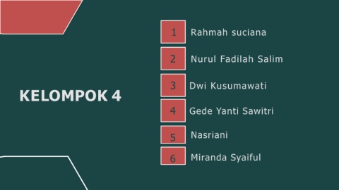 1 Rahmah suciana 2 Nurul Fadilah Salim 3 Dwi Kusumawati KELOMPOK 4 4 Gede Yanti Sawitri 5 Nasriani 6 Miranda Syaiful