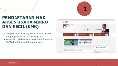 1 PENDAFTARAN HAK AKSES USAHA MIKRO DAN KECIL (UMK) Langkah pertama yang harus dilakukan yaitu mengunjungi situs https://oss.go.id/ Kemudian pelaku usaha dapat memilih menu DAFTAR untuk mendaftarkan usaha Back to Agenda 03