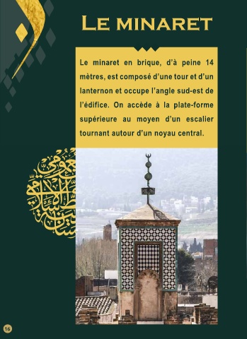 Le minaret Le minaret en brique, d’à peine 14 mètres, est composé d’une tour et d’un lanternon et occupe l’angle sud-est de l’édifice. On accède à la plate-forme supérieure au moyen d’un escalier tournant autour d’un noyau central. 16