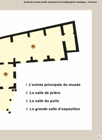 Guide du musée public national de la Calligraphie Islamique - Tlemcen 1. L’entrée principale du musée 2. La salle de prière 3. La salle du puits 4. La grande salle d’exposition 25