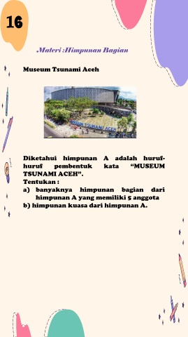 Materi :Himpunan Bagian Museum Tsunami Aceh Diketahui himpunan A adalah huruf- huruf pembentuk kata “MUSEUM TSUNAMI ACEH”. Tentukan : a) banyaknya himpunan bagian dari himpunan A yang memiliki 5 anggota b) himpunan kuasa dari himpunan A.