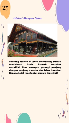 Materi :Bangun Datar Seorang arsitek di Aceh merancang rumah tradisional Aceh. Rumah tersebut memiliki lima ruangan persegi panjang dengan panjang 4 meter dan lebar 3 meter. Berapa total luas lantai rumah tersebut?
