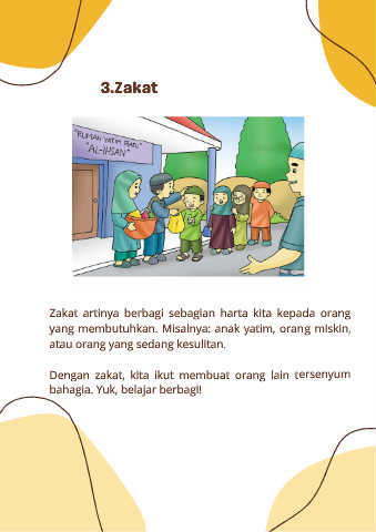 3.Zakat Zakat artinya berbagi sebagian harta kita kepada orang yang membutuhkan. Misalnya: anak yatim, orang miskin, atau orang yang sedang kesulitan. Dengan zakat, kita ikut membuat orang lain tersenyum bahagia. Yuk, belajar berbagi!