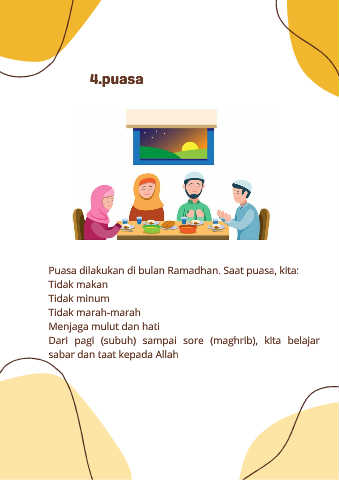 4.puasa Puasa dilakukan di bulan Ramadhan. Saat puasa, kita: Tidak makan Tidak minum Tidak marah-marah Menjaga mulut dan hati Dari pagi (subuh) sampai sore (maghrib), kita belajar sabar dan taat kepada Allah