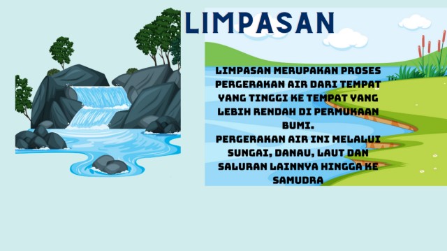 LIMPASAN LIMPASAN LIMPASAN Limpasan merupakan proses pergerakan air dari tempat yang tinggi ke tempat yang lebih rendah di permukaan bumi. pergerakan air ini melalui sungai, danau, laut dan saluran lainnya hingga ke samudra
