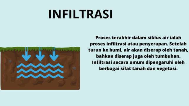 INFILTRASI Proses terakhir dalam siklus air ialah proses infiltrasi atau penyerapan. Setelah turun ke bumi, air akan diserap oleh tanah, bahkan diserap juga oleh tumbuhan. Infiltrasi secara umum dipengaruhi oleh berbagai sifat tanah dan vegetasi.