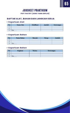 65 JOBSHEET PRAKTIKUM PUFF PASTRY (JENIS YANG DIPILIH) DAFTAR ALAT, BAHAN DAN LANGKAH KERJA Keperluan Alat Keperluan Bahan Keperluan Bahan