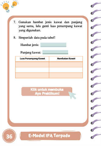 7. Gunakan hambat jenis kawat dan panjang yang sama, lalu ganti luas penampang kawat yang digunakan. 8. Simpanlah data pada tabel! Hambat jenis: Panjang kawat: Luas Penampang Kawat Hambatan Kawat Klik untuk membuka Ayo Praktikum! 36