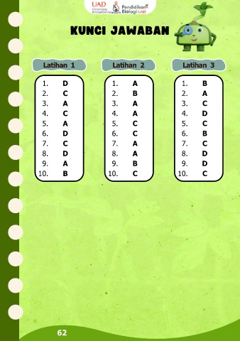KUNCI JAWABAN Latihan 1 Latihan 2 Latihan 3 1. D 1. A 1. B 2. C 2. B 2. A 3. A 3. A 3. C 4. C 4. A 4. D 5. A 5. C 5. C 6. D 6. C 6. B 7. C 7. A 7. C 8. D 8. A 8. D 9. A 9. B 9. D 10. B 10. C 10. C 62