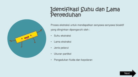 Identifikasi Suhu dan Lama Penyeduhan Proses ekstraksi untuk mendapatkan senyawa-senyawa bioaktif yang diinginkan dipengaruhi oleh : • Suhu ekstraksi • Lama ekstraksi • Jenis pelarut • Ukuran partikel • Pengadukan fluida dan kepolaran Next