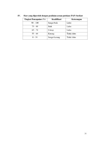 IV. Skor yang diperoleh dengan penilaian acuan patokan (PAP) berikut Tingkat Pencapaian (%) Kualifikasi Keterangan 90 – 100 Sangat baik Lulus 75 – 89 Baik Lulus 65 – 74 Cukup Lulus 55 – 64 Kurang Tidak lulus 0 – 54 Sangat kurang Tidak lulus 31