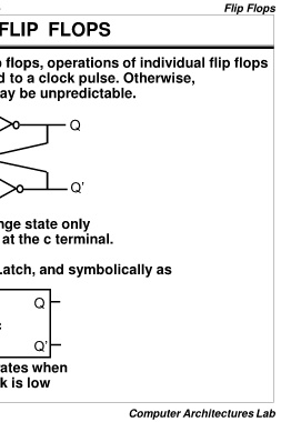 4 Flip Flops FLIP FLOPS p flops, operations of individual flip flops d to a clock pulse. Otherwise, may be unpredictable. Q Q’ nge state only at the c terminal. Latch, and symbolically as Q c Q’ rates when k is low Computer Architectures Lab