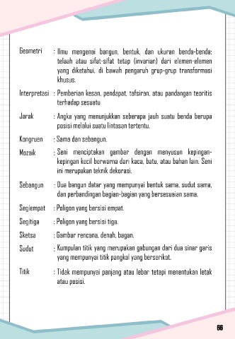 Geometri : Ilmu mengenai bangun, bentuk, dan ukuran benda-benda;