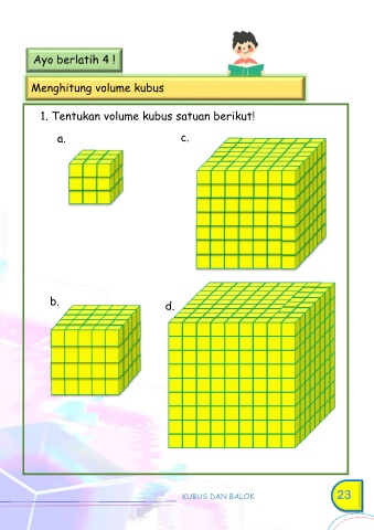 Ayo berlatih 4 ! Menghitung volume kubus 1. Tentukan volume kubus satuan berikut! c. a. b. d. KUBUS DAN BALOK 23