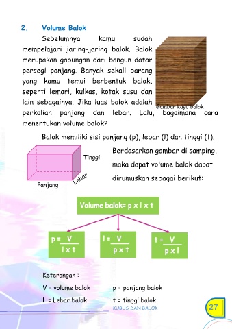Balok memiliki sisi panjang (p), lebar (l) dan tinggi (t).