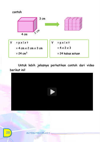contoh 3 cm 4 cm V = p x l x t V = p x l x t = 4 cm x 2 cm x 3 cm = 4 x 2 x 3 = 24 cm 3 = 24 kubus satuan Untuk lebih jelasnya perhatikan contoh dari video berikut ini! 28 MATEMATIKA KELAS V