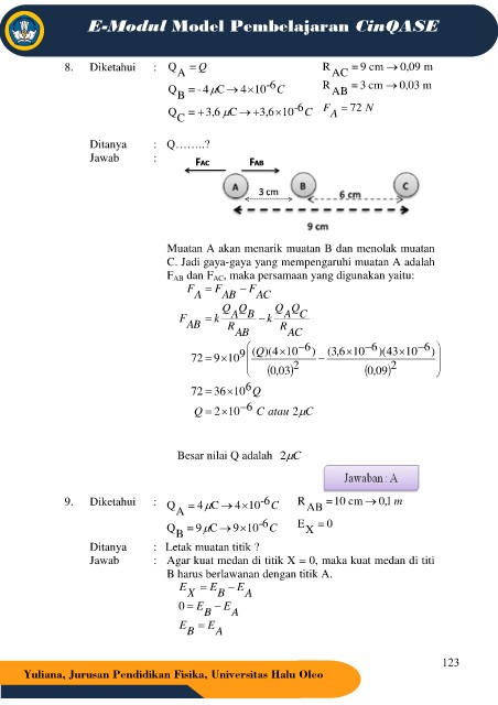 8. Diketahui : Q A = Q R AC 9 = cm 0,09 m