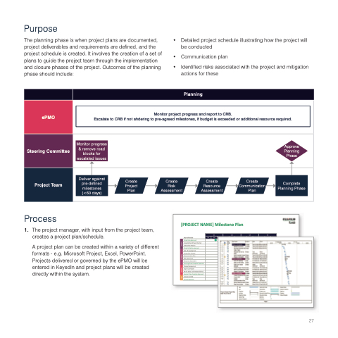 A project plan can be created within a variety of different formats - e.g. Microsoft Project, Excel, PowerPoint. Projects delivered or governed by the ePMO will be entered in KeyedIn and project plans will be created directly within the system.