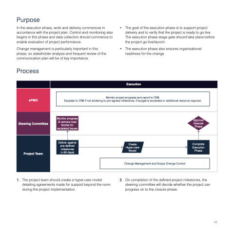 • The goal of the execution phase is to support project delivery and to verify that the project is ready to go-live. The execution phase stage gate should take place before the project go-live/launch.
