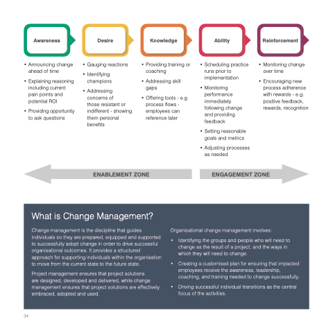 • Creating a customised plan for ensuring that impacted employees receive the awareness, leadership, coaching, and training needed to change successfully.