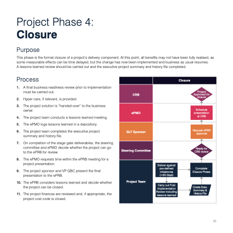 This phase is the formal closure of a project’s delivery component. At this point, all benefits may not have been fully realised, as some measurable effects can be time delayed, but the change has now been implemented and business as usual resumes.