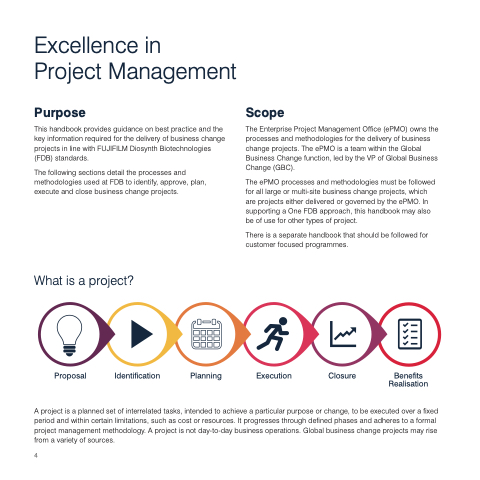 This handbook provides guidance on best practice and the key information required for the delivery of business change projects in line with FUJIFILM Diosynth Biotechnologies (FDB) standards.