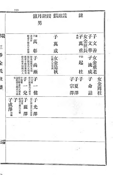 139 錢月鍾銀 鋼錯O B 男 配通子繼 子 I子女子子 迎 德 日 郞% 萬 | 文文 鄭 RJ 萬 成 重長華善 ¥ —퍠 子女 起 間 潮 柱 成老 브 文繼配字三己 配字:己 子子子 子 rr 江元三T 迎酸甫 珍甫 —- —- 宗夏 命 ai 健 澤澤 語 子子 迎 而子 로子 配字 成 日 a 澤 麗 1 光 出 繼 澤 8 澤
