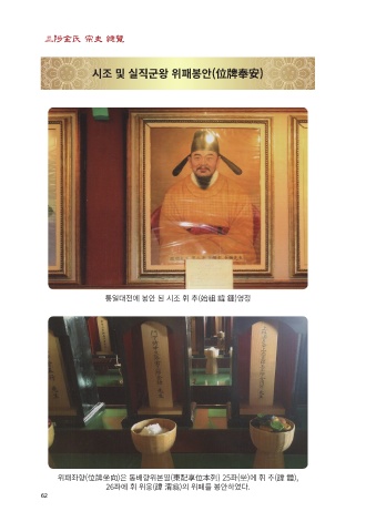 三陟金氏 宗史 總覽 시조 및 실직군왕 위패봉안(位牌奉安) 통일대전에 봉안 된 시조 휘 추(始祖 諱 錘)영정 위패좌향(位牌坐向)은 동배향위본열(東配享位本列) 25좌(坐)에 휘 추(諱 錘), 26좌에 휘 위옹(諱 渭翁)의 위폐를 봉안하였다. 62