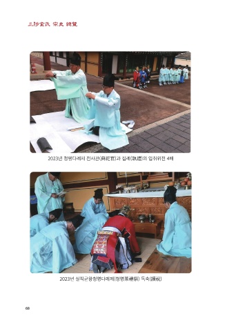 三陟金氏 宗史 總覽 2023년 청명다례제 전사관(典祀官)과 집례(執禮)의 입취위전 4배 2023년 실직군왕청명다례제(청명茶禮祭) 독축(讀祝) 68