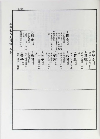 1015 三 陟 金 配 子 氏 配 孑 生壬碧竹丑庚壬工 月日庚字w 大 城生寅畫鍍 于■長吉辰奎鎮 同 食士克圭 斤氏却於]泰 譜 父 月태 진 二 渗九二태 진 1 太二 규 十陰日日 태 二 卷 由女七空子圧丁女止至空子止戸空子羊女 4m女甲女 奉琴鞋元員淑生寡明生飄大珠賛英畏琴 耳子罷河 士子 京奋河 體河■美 青順3공 T 금 二완 원 月 숙 二완 명 二완 대 十 영 二 영 千 号 } 자 日 하 三 사 十 하 十 하一 미 十 순十 자
