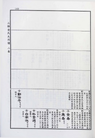 149 三 陟 金 氏 大 同 譜 二 卷 延女 工 酉己 哲 宣奠 B 青京胃쪗斐全卒生廟 人仕 艮五卷譯緞 줔 • HIB 義 ________평 iiH? 九合 今초 第吉四奎志通陰坐卒生扁字흐 子 金庚午一擘考丙當 學 白!* 차杏政陽 支戊癸啓應 奎 谷午九祿蓮菜申 丙 人南人奎生卒篇盡賈 気辜父菊寿 毒处音희琴畲春咅生 督 週 諡龍 都卒瑞 좇*建縫鞄 a 굮 서賃뿦呈 僵TH F 二 拿豐九予堂千月五 -- 숙 연 十鍾善祖 庚日 日 六下坐墓旦■여"戮