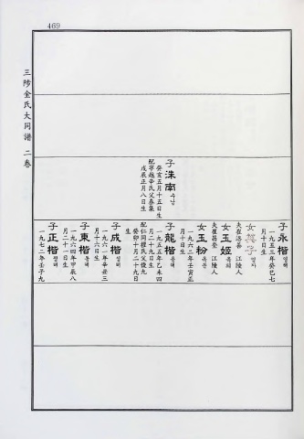 469 三 陟 金 氏 大 同 譜 二 卷 配 子 寧 戊 癸 越 辰 亥 洙 辛 正 五 南 氏 月 月 父 八 十 수 泰 日 五 남 集 生 日 生 一 一子 月—子月—子生癸圾月一子 月一女蚕女蚕女 月一子 九正;九東十九成而*二九龍3九玉嘗玉黨英辛九永 芝楷北楷評楷 方鬻瑟楷旦즈粉奎姬켬子旦之階 年 정 日年 동生年 성 二父日年 용 年 옥江 옥江 영 年 영 壬 해 生甲 해 辛 해 十俊生乙 해 壬 분陵 희 陵 자 癸 해 子 辰 丑 九九未 寅 人 人 巳