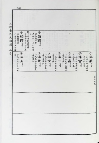 547 三 陟 金 孑 配 子 氏 乙字」 壬全生壬字」 酉福才目午州午斗榮 大 同 將鎔議蛍鎔 1 十권상十冬月영영 譜 • 五 용 四学 十 용 二 卷 . *子~ 日 우* 日 *女W 孑W 日 -子^ *子W *子" 生工洙 六九洙十冬淑卒九洙六九洙2九洙月九洙 吉山 A元鼠女農一跷昌纪吉坟巖 二수 宠수生年 숙 年 수 年 수 日 年 수 日 年 수 十산 争원 丁 녀 癸일 己창生辛길生店 암 二 月 六 • 日 生 一 ____ ________ 一_一— -----