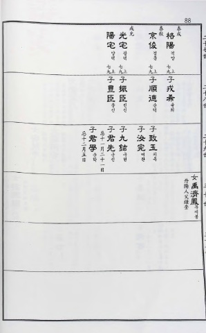 戎 泰 4 I 陽光允 京秋 格晟 宅宅 俊 陽 양 광 경 격 택 택 주 £ 七 七 也上 也上1 九上九上 子子 子 子 豊振 順 戎 — 臣臣 5宜 希 〃心 풍 진 수 흉 신 신 5 희 忌 子己子子 子子 十 君干君九 二 汝致 月 學万先鉱 五 完玉 日 군二군 구 여 치 女 丹 禹 陽 三 人 濟 十 父 鍾 鳳 世 奎 우 제 봉 三 十 一 世 三 十 二 旭