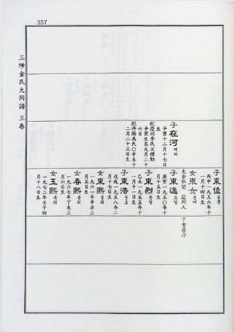 357 三 陟 金 氏 大 同 譜 三 卷 二丹六辛慶生辛士 月陽日酉州酉在 豫it 士河 二。 九冬 月 재 曰辛 月饉 f 하 月 —女 月 —女 月一女 月戊子 一乙子 月庚子 추女 —丙子 十元玉六晟春五工東十戌東Z未東十寅東恭東E申東 貝熙跷熙旦二熙找浩員烈f晨逸燮女肾俊 生年 옥 年 준 年 话■生五 통日五 동生五 도 度 동日五 돔 壬희 丁窃 宰回 八 호 生五열 O 일 州 周生六 준 子 未 丑 年 年 年 人 年 子 金 昌 壽