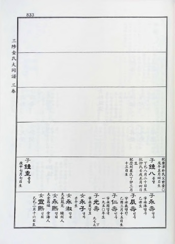 833 三 陟 金 氏 大 同 譜 三 卷 fS 電生彩喜우} ■重 It靑扌八月* 七 종 丁 正二 종四父 日 중 处月十 팔日世 乙女方女査女壬女字子—字子乙字子乙字子 巳宣旨 永 蔵 永 午 永 永 光九索 仁 酉 후 辰 丑 索 永 瓦熙福熙完淑生子哥壽舞壽請毒生書蠢 十선金 영綾 영 영호 牟국인 +진 진 수영 六 희海 희 州 슥 자 九生 수五 수 수 日 人 人 七 日 生 九下 生