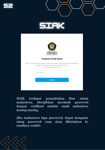 SIAK terdapat penambahan fitur untuk mahasiswa, diwajibkan merubah password dengan verifikasi melalui email mahasiswa masing-masing. Jika mahasiswa lupa password, dapat mengatur ulang password yang akan dikirimkan ke emailnya sendiri.