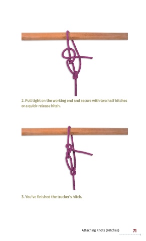 2. Pull tight on the working end and secure with two half hitches or a quick-release hitch. 3. You’ve finished the trucker’s hitch. Attaching Knots (Hitches) 71 BPM_OutdoorKnots_4pp.indd 71 8/30/10 2:40 PM
