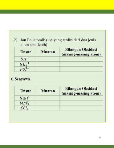 2) Ion Poliatomik (ion yang terdiri dari dua jenis atom atau lebih) Bilangan Oksidasi Unsur Muatan (masing-masing atom) − + 4 3− 4 C. Senyawa Bilangan Oksidasi Unsur Muatan (masing-masing atom) 2 2 4 30